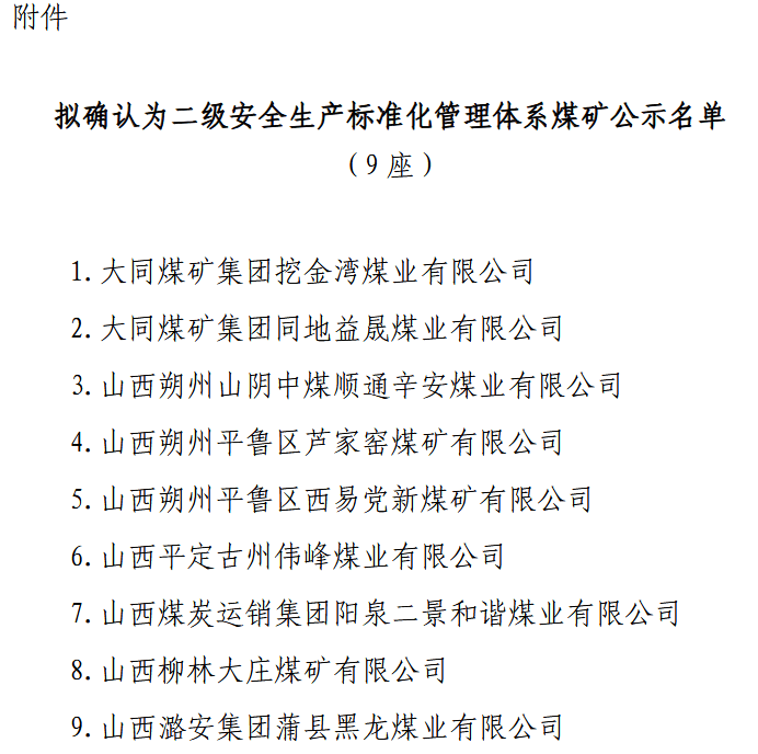 擬確認(rèn)二級(jí)安全生產(chǎn)標(biāo)準(zhǔn)化管理體系煤礦的公示